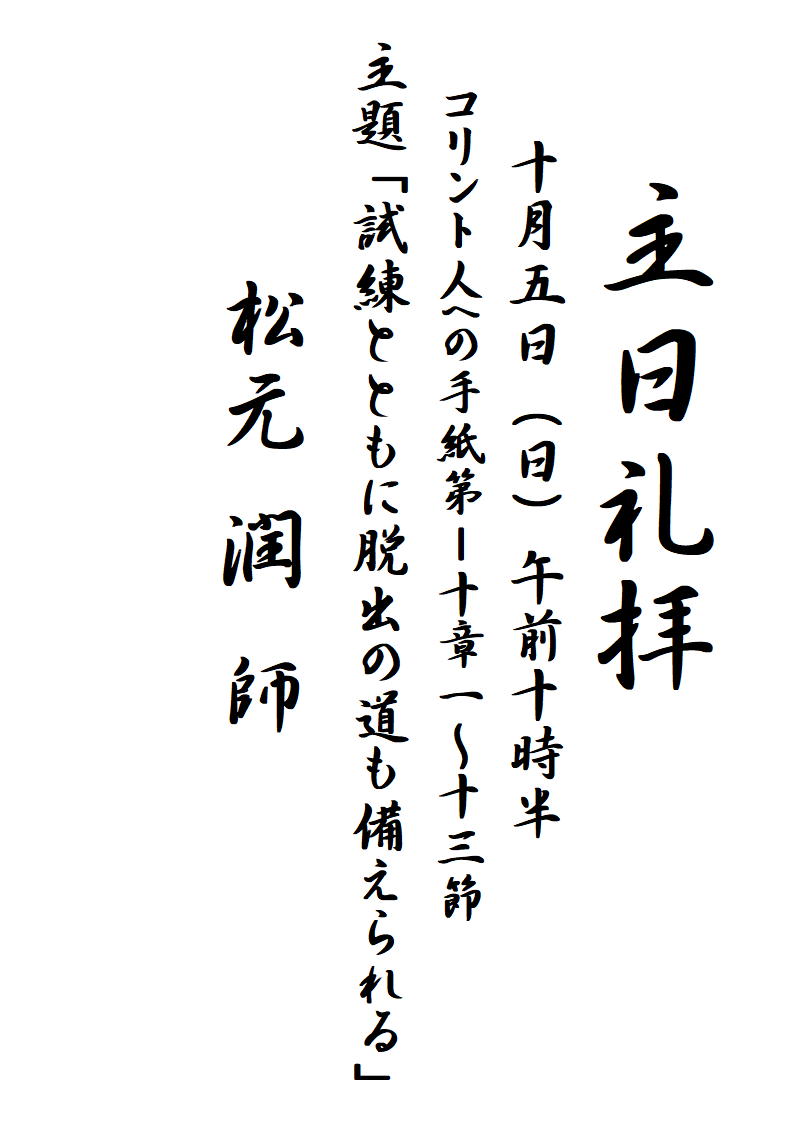 10月5日 主日礼拝 宣教 松元 潤 師 主題「試練とともに脱出の道も備えられる」 2025 9/30 主日礼拝 過去宣教題 主日礼拝 若葉キリスト教会 関連記事関連する記事はまだ見つかりませんでした。