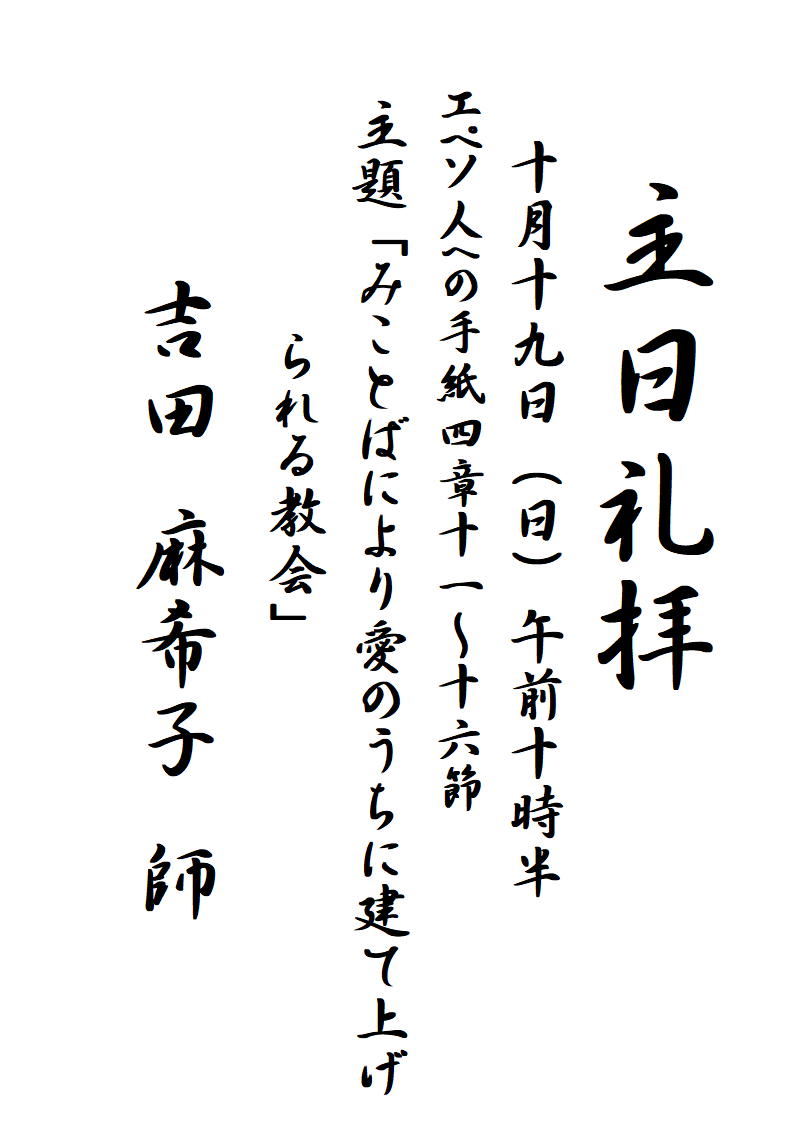 10月19日 主日礼拝 宣教 吉田 麻希子 師 主題「みことばにより愛のうちに建て上げられる教会」 2025 10/13 主日礼拝 過去宣教題 主日礼拝 若葉キリスト教会 関連記事関連する記事はまだ見つかりませんでした。